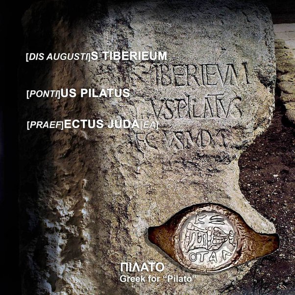 नयाँ करारका अतिरिक्त यहूदी लेखकद्वय योसिफस र फाइलोसाथै रोमी लेखक टासिटसका रचनाहरूमा पिलातसका सन्दर्भहरू उल्लेख भए तापनि वर्षौंसम्म आलोचकहरूले पिलातसको साँचो अस्तित्वमाथि नै प्रश्न गर्दै आएका थिए । ख्रिस्टाब्द १९६१ को जुन महिनामा इटालीका पुरातत्त्वविद् डा. एन्टोनिओ फ्रोभाको नेतृत्वमा गएको टोलीले कैसरिया मरितिमा नामक प्राचीन सहरमा हेरोद महान्द्वारा निर्मित प्राचीन रङ्गशालाको उत्खनन गरिरहेका थिए ।