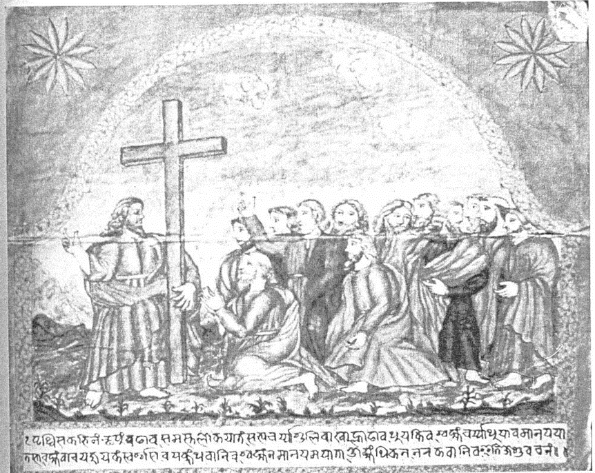 This is an image of the frontispiece of “Satya Sakshi Parmeshvarya Mahima”, a treatise on monotheism composed in Newari in 1740 for King Ranajit Malla of Bhaktapur. It was written by Padre Vito da Recanati, a Catholic Capuchin missionary, with the assistance of his Newari language teacher in Bhaktapur, Brahman Balagovinda.