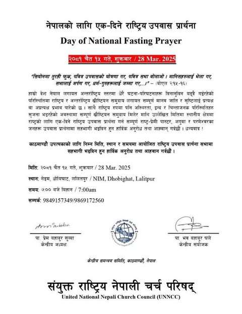 - संयुक्त राष्ट्रिय नेपाली चर्च परिषदले देशव्यापि राष्ट्रको लागी उपवास प्रार्थना सभा आयोजना गर्ने भएको छ ।